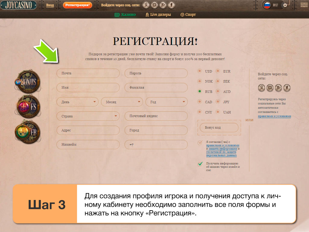 Для использования всех возможностей Joy Casino, новому клиенту придется пройти регистрацию на официальном сайте. Самый простой способ – это воспользоваться формой. К ней можно получить доступ прямо на главной странице сайта. Далее указать адрес электронной почты, пароль и выбрать валюту. После этого на почту придется письмо от клуба с ссылкой, по которой нужно перейти. Игроку необходимо это сделать и в конце остается лишь осуществить вход на сайт.