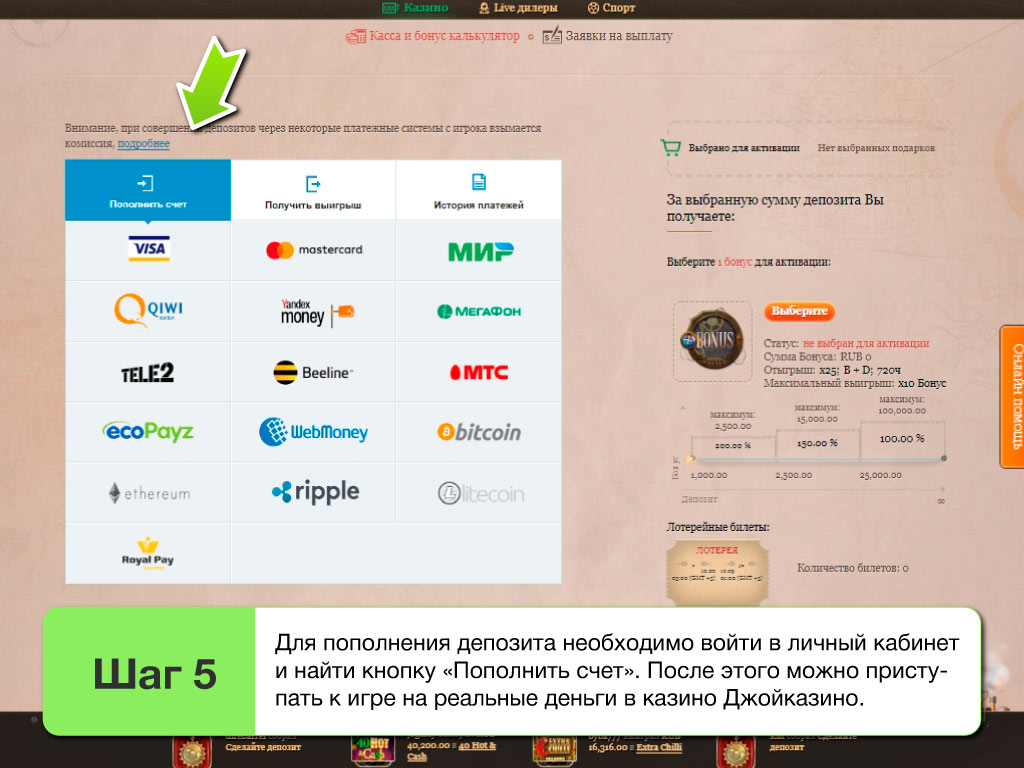 По правилам Джойказино минимальный депозит может составлять 500 рублей. Столько же можно вывести с сайта, не меньше. При этом платежные системы, которые помогут совершать данные операции, есть следующие: