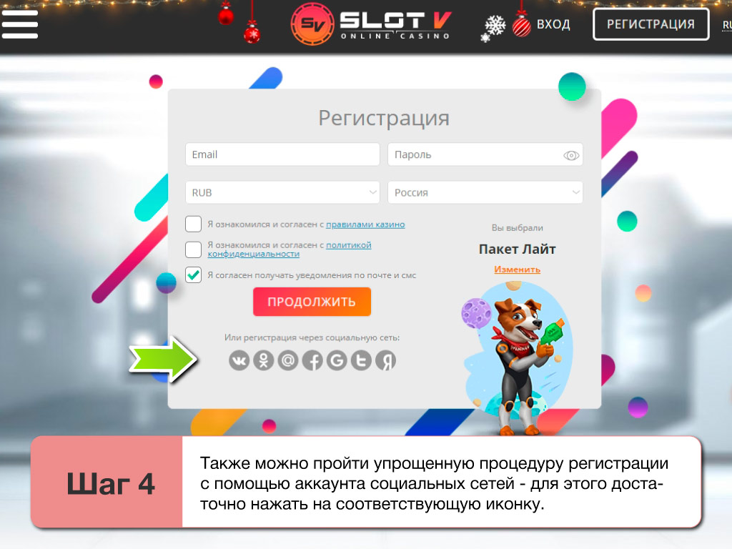Есть и ускоренный метод регистрации в SlotV club, через существующие персональные профили в известных соцсетях: ВКонтакте, ОК, Facebook и пр. Зарегистрироваться в клубе можно как в браузерной, так и в мобильной версии казино, с помощью гаджетов на Андроид или iOS.
