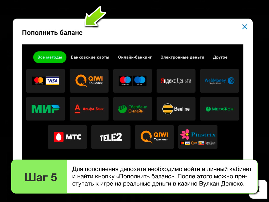 Минимальный депозит, который можно сделать в Vulkandeluxe casino 2025 составляет 500 рублей. Столько же минимально можно вывести, меньше не разрешают. Сделать депозит или забрать выигрыши можно с помощью следующих платежных систем: